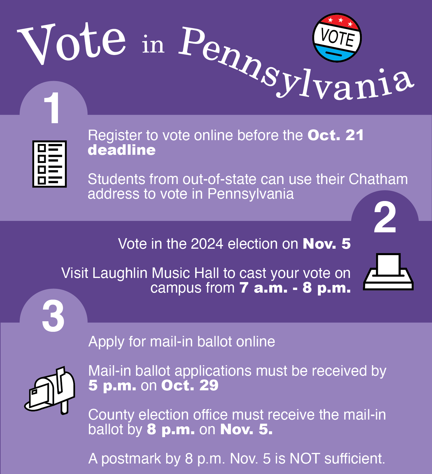 The Pennsylvania Center for Women and Politics (PCWP) is hosting voter registration events on the Chatham Shadyside campus quad to help students get ready to vote in the 2024 general election.